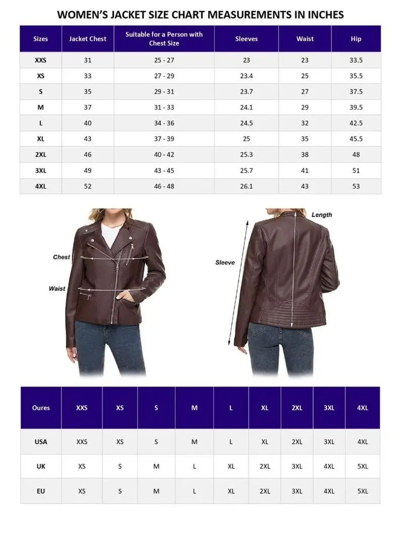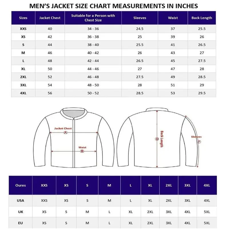 1. Buyers are requested to select their size based on the provided size chart. Our jackets are made according to these measurements.